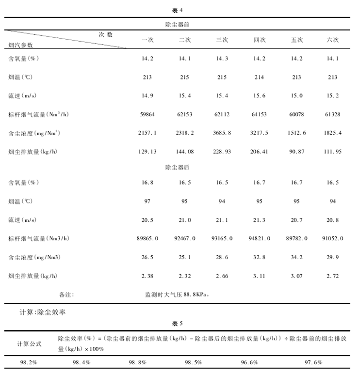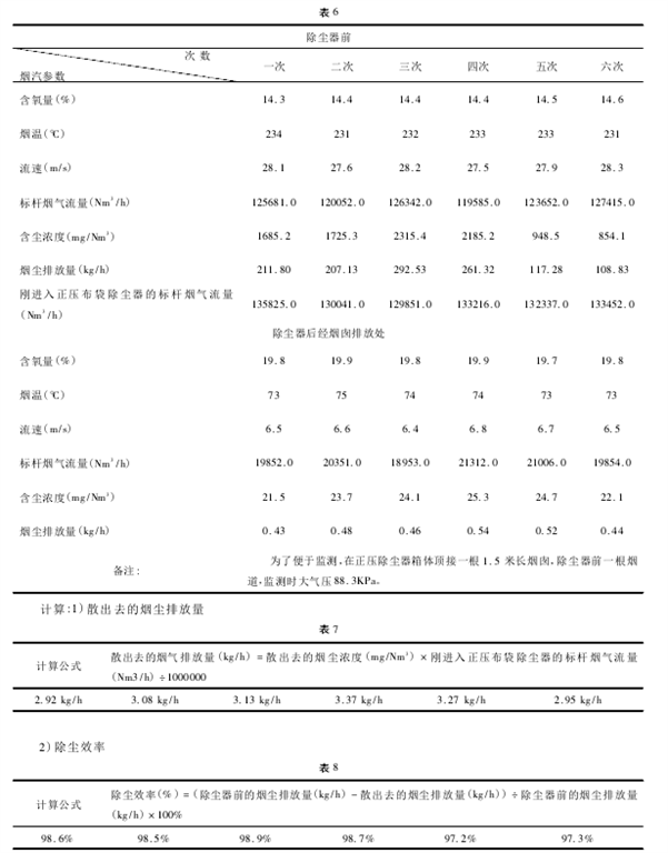 布袋除塵器的六組排放量,可以看出它們的排放量基本相同,誤差很小,所以這種方法又得到了實(shí)際監(jiān)測(cè)的肯定,這為我們?nèi)蘸蟊O(jiān)測(cè)正壓除塵器提供了一種實(shí)用正確的監(jiān)測(cè)方法。