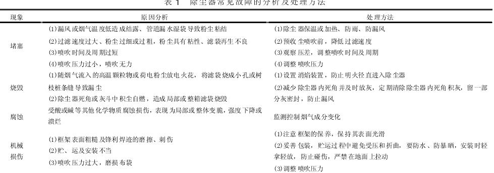 在除塵器的日常運(yùn)行中,由于運(yùn)行條件會(huì)發(fā)生某些改變,或者出現(xiàn)某些故障,都將影響設(shè)備的正常運(yùn)轉(zhuǎn)狀況和工作性能,要定期地進(jìn)行檢查和適當(dāng)?shù)恼{(diào)節(jié),降低動(dòng)力消耗及回收有用的物料。 同時(shí),特別要堵住除塵器排灰口的漏風(fēng),因?yàn)樵诔龎m器的灰斗中有大量緩慢下落的粉塵, 逆流向上的漏風(fēng)氣流又造成下落粉塵的二次飛揚(yáng)及多次循環(huán), 因而排灰口漏風(fēng)可使除塵器內(nèi)的粉塵濃度成倍地高于入口的粉塵濃度, 這樣_惡化了除塵器的工作條件,影響了除塵效率[5] 。 除塵器常見(jiàn)故障的分析及處理方法見(jiàn)表 1,電磁閥常見(jiàn)故障的分析和處理方法見(jiàn)表 2。