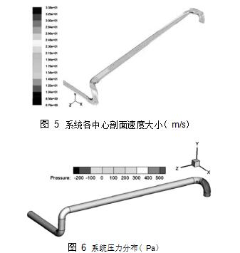 圖 5、圖 6 分別顯示了低溫?zé)煹赖乃俣?、壓力?/div>分布情況。由圖可知,系統(tǒng)速度大小為 6. 76 ~ 33. 8m /s,_值出現(xiàn)在彎頭的內(nèi)側(cè)且大于煙氣入口值,_小值出現(xiàn)在彎頭的外側(cè),直段的速度約在 19. 4 ~21. 2 m /s,壓力_值出現(xiàn)在彎頭的外側(cè),_小值發(fā)生在彎頭的內(nèi)側(cè),且_個(gè)彎頭外側(cè)壓力值明顯高于后續(xù)幾個(gè)彎頭的壓力值。這是因?yàn)榱黧w經(jīng)過(guò)彎頭時(shí),雖然過(guò)流斷面沿程不變,但彎頭內(nèi)流體質(zhì)點(diǎn)受到離心力作用,在彎頭前半段,外側(cè)壓強(qiáng)沿程增大,內(nèi)側(cè)壓強(qiáng)沿程減小,而流速則是外側(cè)減小,內(nèi)側(cè)增大。因此,彎頭前半段沿外壁是減速增壓的,出現(xiàn)旋渦區(qū); 在彎頭的后半段,由于慣性作用,在 Re 很大、彎頭轉(zhuǎn)角較大、曲率半徑較小的情況下,旋渦區(qū)再次出現(xiàn)。彎頭內(nèi)側(cè)的旋渦,無(wú)論是大小還是強(qiáng)度,一般都[5] ,比外側(cè)的大 。這些因素加劇了煙道的局部沖刷影響到煙道的運(yùn)行年限。