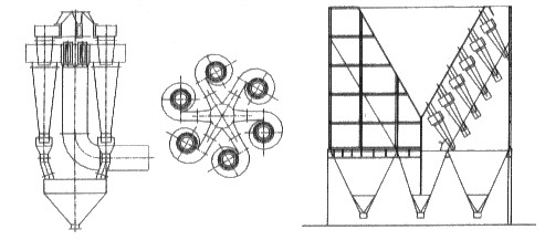 處理氣體量較大時,可以采用多個旋風(fēng)器單體進(jìn)行并聯(lián)組合。( 1 )多筒組合:多筒組合可以采用分支并聯(lián)和環(huán)狀并聯(lián)方式,見圖 2 。組合技術(shù)的關(guān)鍵在于含塵氣流分配的均勻性和防止氣流串流。分支并聯(lián)一般采用雙旋風(fēng)器、四旋風(fēng)器方式。對于處理氣體量較大時,也可以采用母管分支并聯(lián)方式。分支旋風(fēng)器一般采用渦殼排氣方式。( 2 )多管組合:多管組合可以采用數(shù)十個旋風(fēng)子(小尺寸旋風(fēng)器)進(jìn)行箱式并聯(lián)安裝。旋風(fēng)子在進(jìn)氣箱體中可以采用順排并聯(lián)或錯排并聯(lián),采用慣性沉降一旋風(fēng)子兩級一體復(fù)合除塵參見圖 3 ,含塵氣流分配的均勻性可以通過調(diào)整旋風(fēng)子進(jìn)氣口角度、排氣芯管長度、進(jìn)氣空間高度、旋風(fēng)子間距等措施實現(xiàn)。